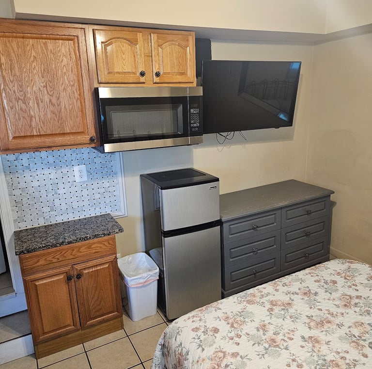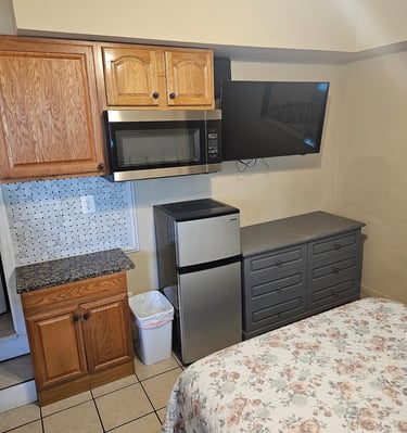 The kitchenette area contains a refrigerator and microwave. There is not an oven, cooktop, or large sink located in this space.